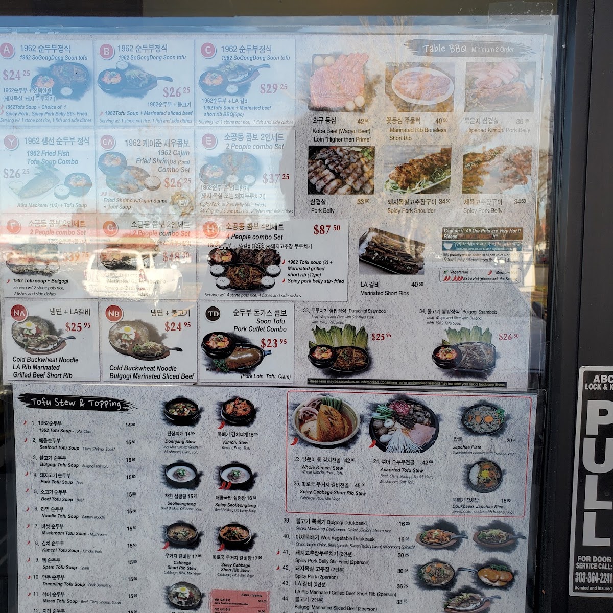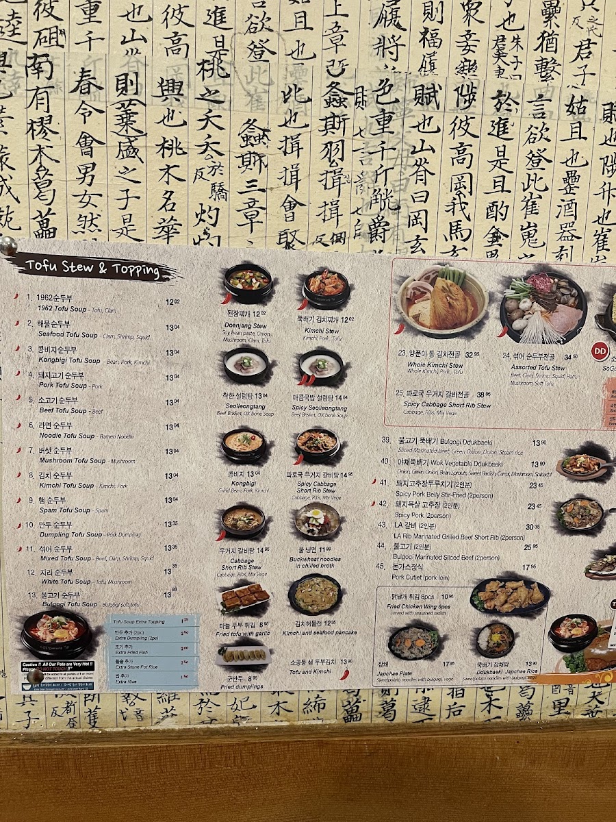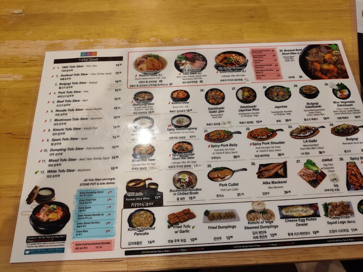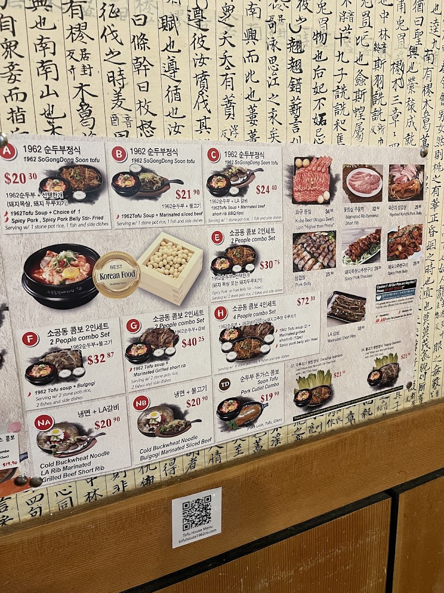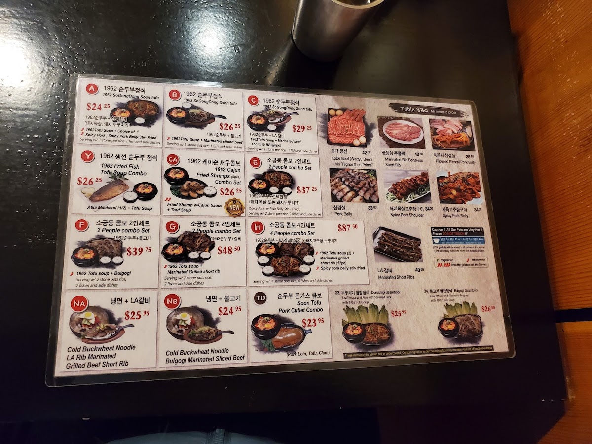1962 Tofu soup + Marinated Grilled short rib(12pc) Serving w/ 2 rice, 2 fishes and 3 side dishes. Ingredient-(Silken-Tofu, Traditional Tofu Sauce, Green Onion, Clam, Beef, Traditional Rib Sauce)