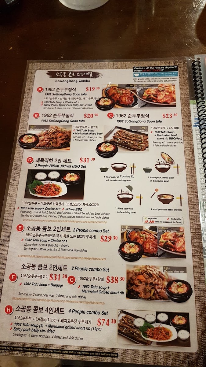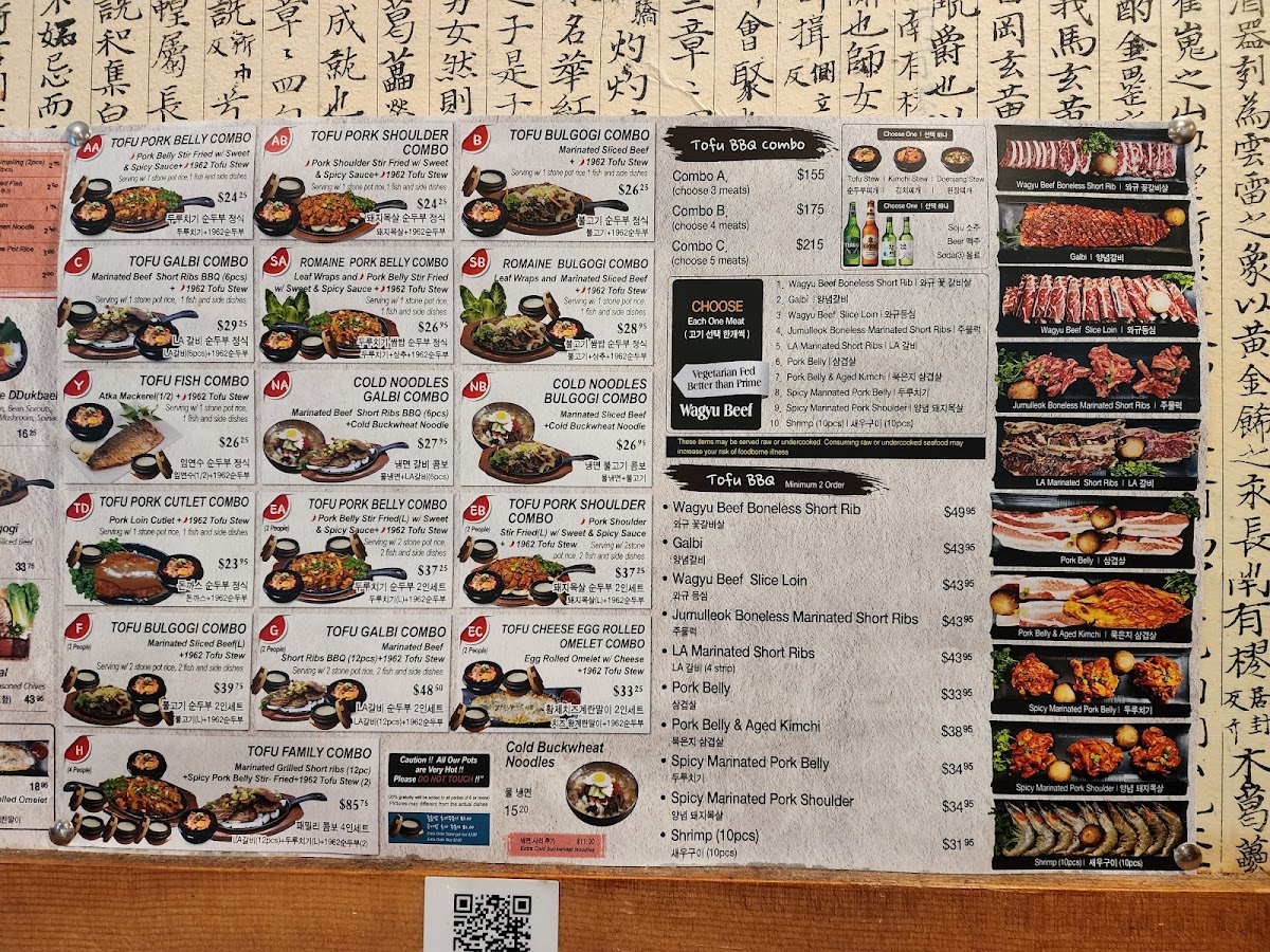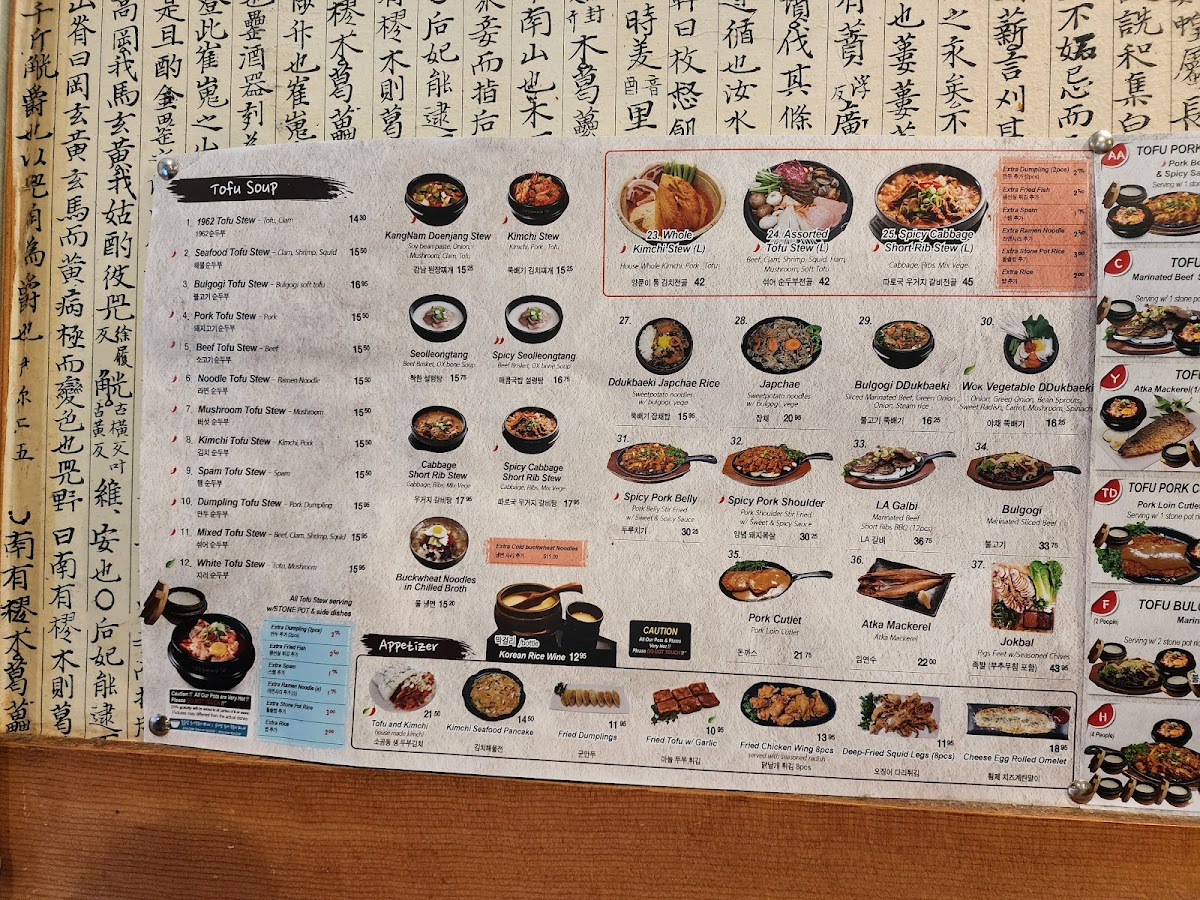 1962 Tofu soup (2) + Marinated grilled short rib (12pcs) Spicy pork belly stir- fried Serving w/ 4 rice, 4 Fried fishes and 3 side dishes *Ingredient-(Silken-Tofu, Traditional Tofu Sauce, Green Onion, Clam, Beef, Pork belly, Beef Short Ribs )